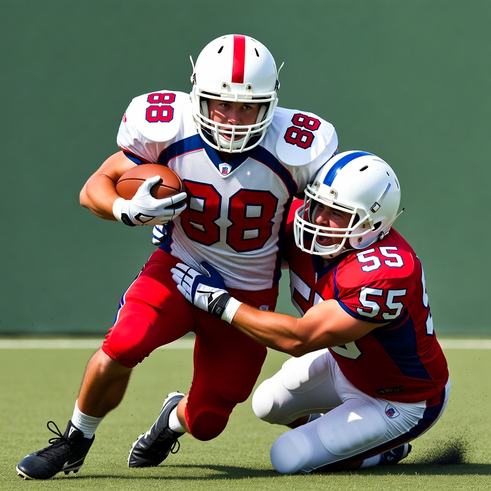A White football player in a white and red jersey numbered 88 holds the ball while being tackled by another White player in a red and navy jersey numbered 55. Both wear helmets and pads during the intense play on a green turf field with a solid green background wall. The ball carrier lunges forward as the defender grabs his waist low.