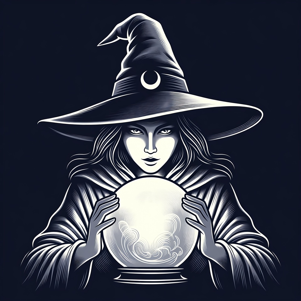 A detailed black and white line art illustration depicts a woman dressed as a witch with a tall pointed hat adorned with a crescent moon. She has long flowing hair and intently gazes into a glowing crystal ball held in her hands. She wears a hooded cloak and stands against a dark isolated background.