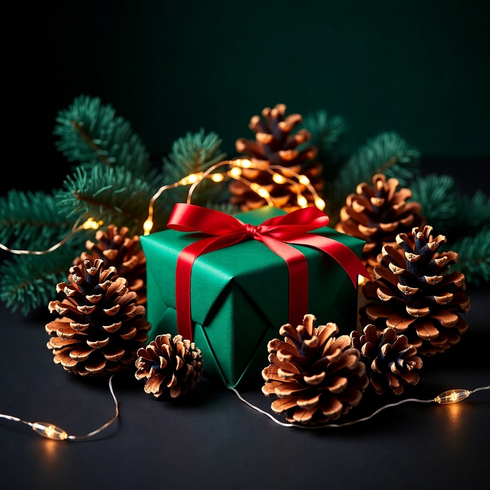 A green gift box wrapped with a red ribbon sits centered on a dark background, surrounded by pine branches and multiple pine cones. Twinkling fairy lights drape around the arrangement, adding a festive glow. The scene evokes Christmas holiday decor with natural evergreen elements.