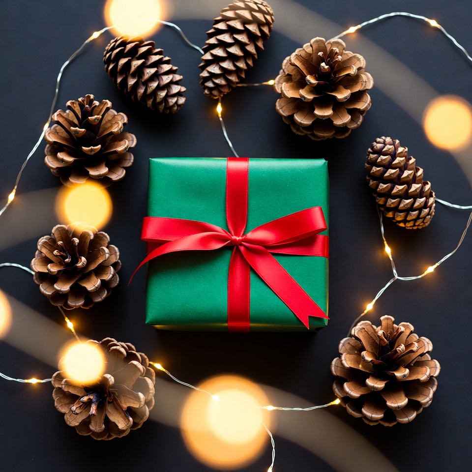 A green gift box wrapped with a red ribbon sits centered on a dark background, surrounded by scattered pine cones. Twinkling fairy lights and bokeh effects circle the arrangement, adding a festive holiday touch. The composition is a flat lay with natural textures on the cones and glossy wrapping paper.