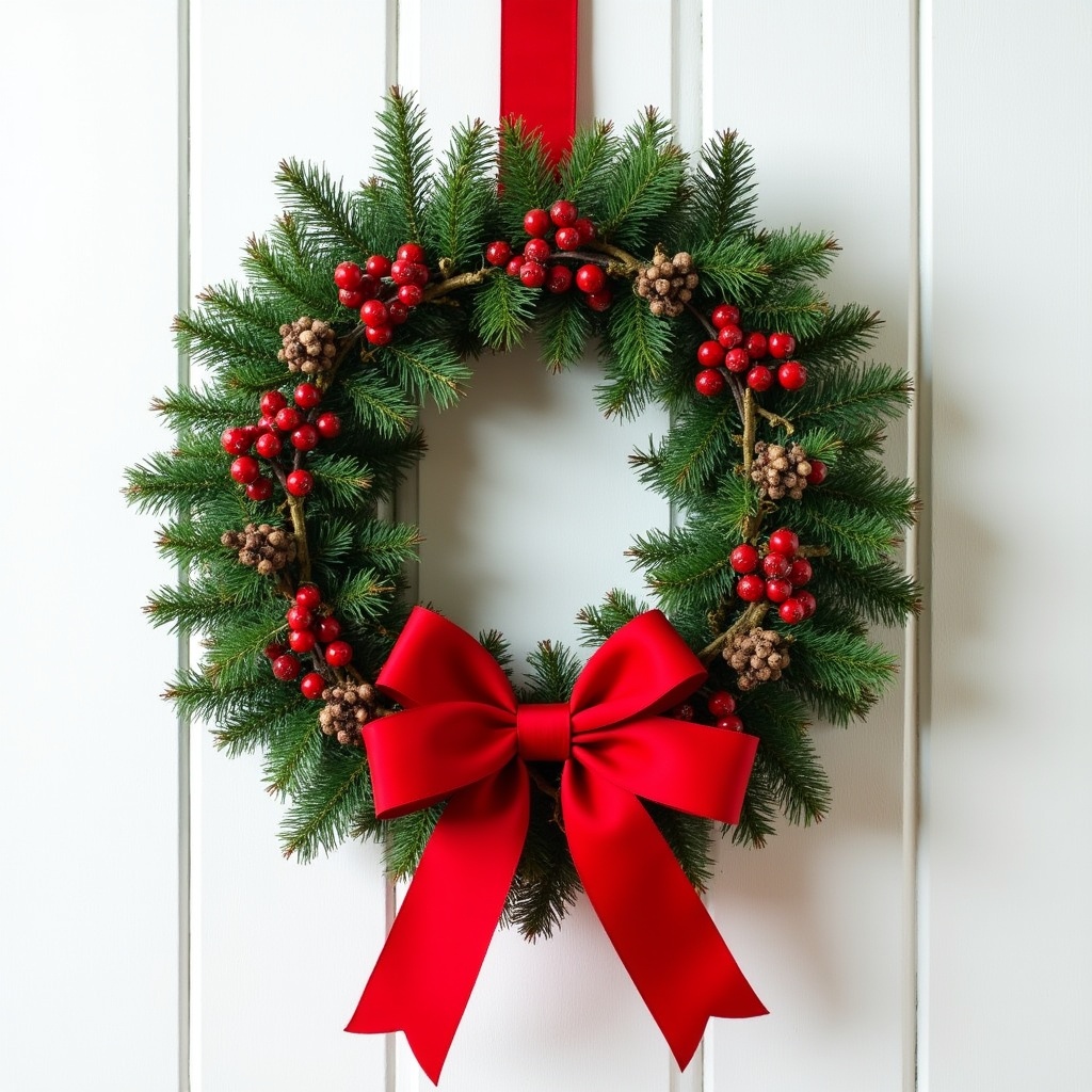 Christmas decoration, berries, cones, door wreath, evergreen wreath, festive wreath, fir branches, green wreath, holiday decor, holiday wreath, holly berries, paneled door, pine cones, red berries, red bow, red ribbon, satin bow, white door, winter wreath, Christmas wreath