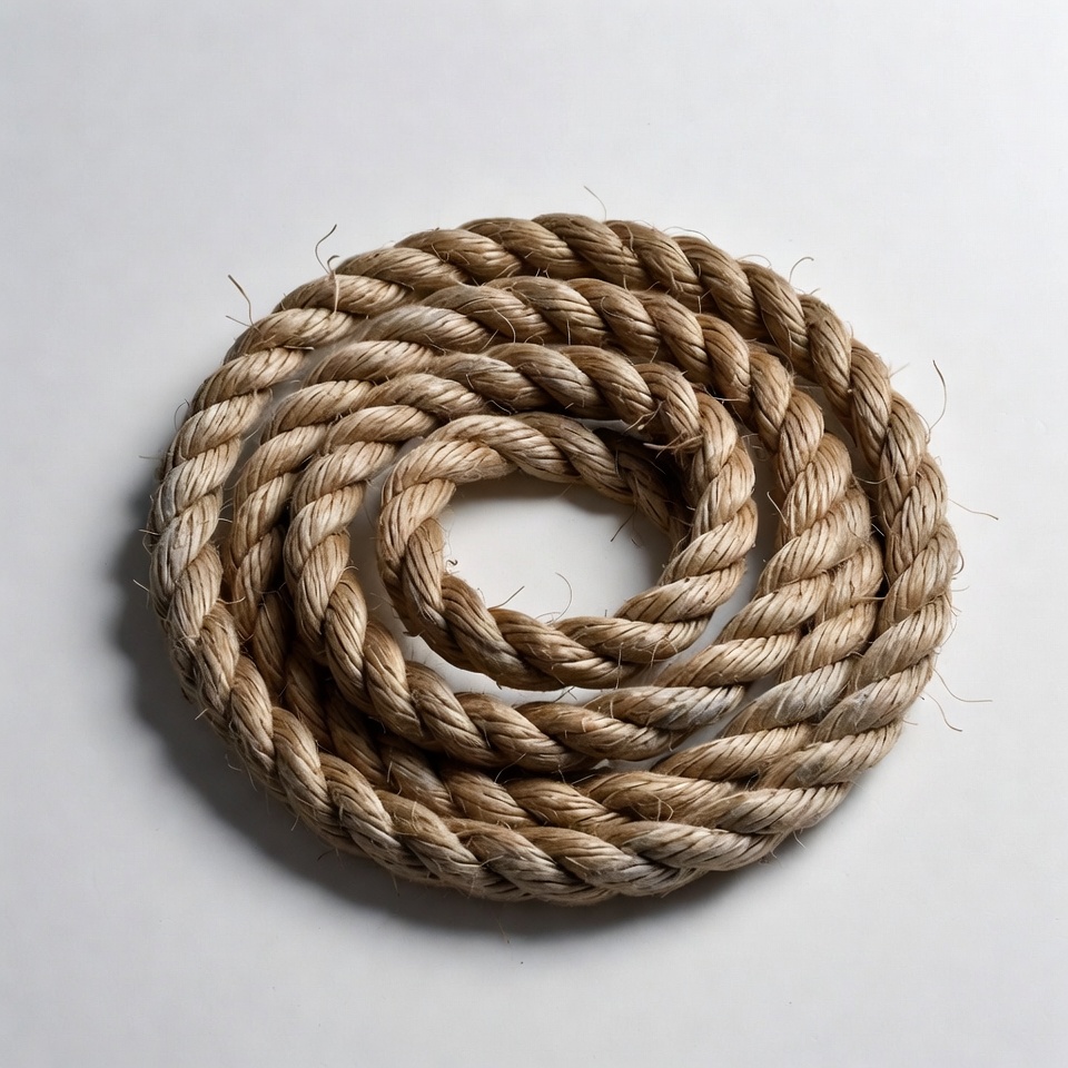 A thick brown rope is tightly coiled into a circular spiral shape. It rests on a plain white background, showcasing its twisted fibers and frayed edges. The rope forms a neat loop with an open center.