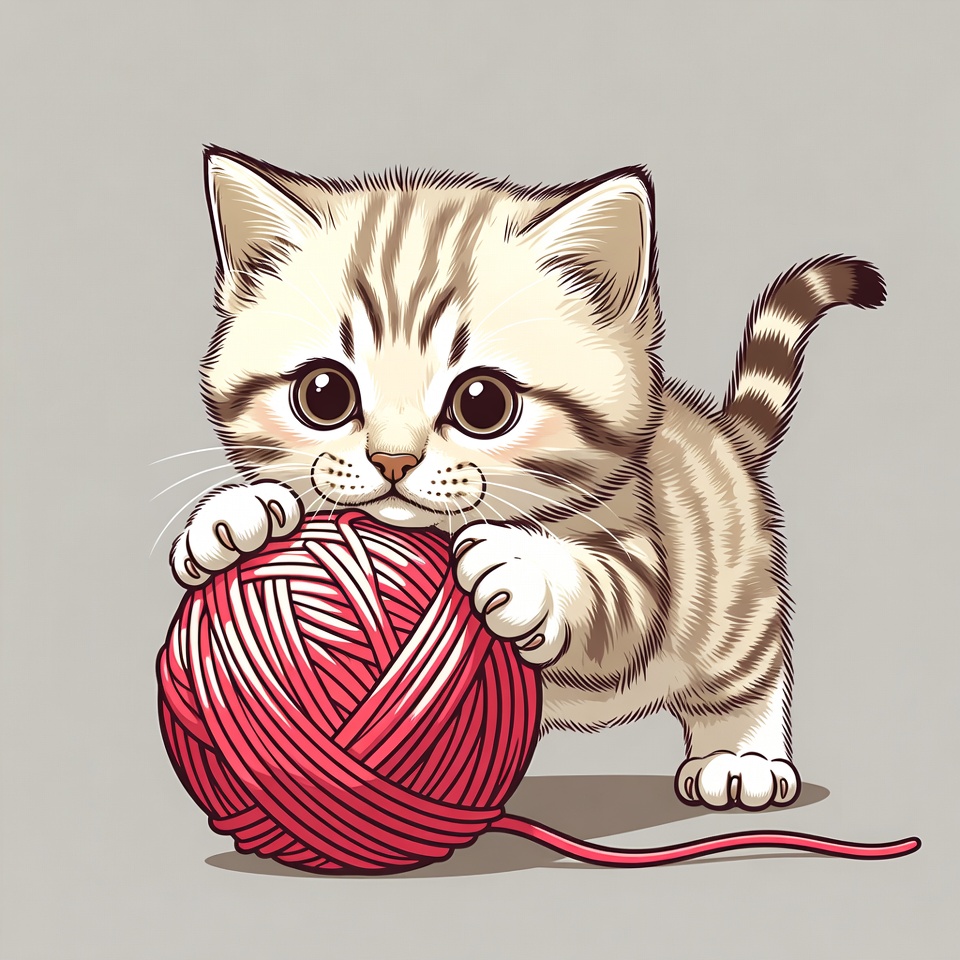 An adorable tabby kitten with big eyes grips a red ball of yarn with its paws. The fluffy kitten stands on a plain gray background, playfully holding the yarn. Its striped fur and tiny paws are detailed in a cute illustration style.