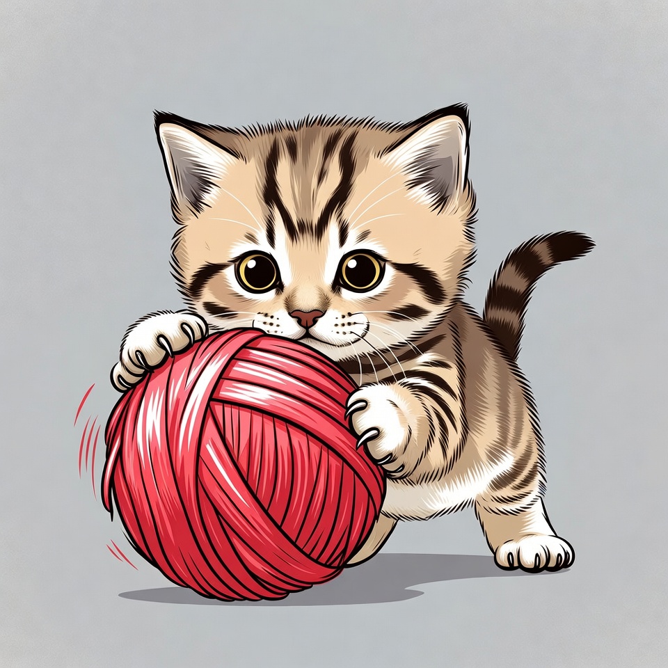 A cute tabby kitten with big eyes plays with a large red ball of yarn on a gray background. The kitten grips the yarn tightly with its paws, pulling and batting at it playfully. The illustration features fluffy fur details and a dynamic pose.