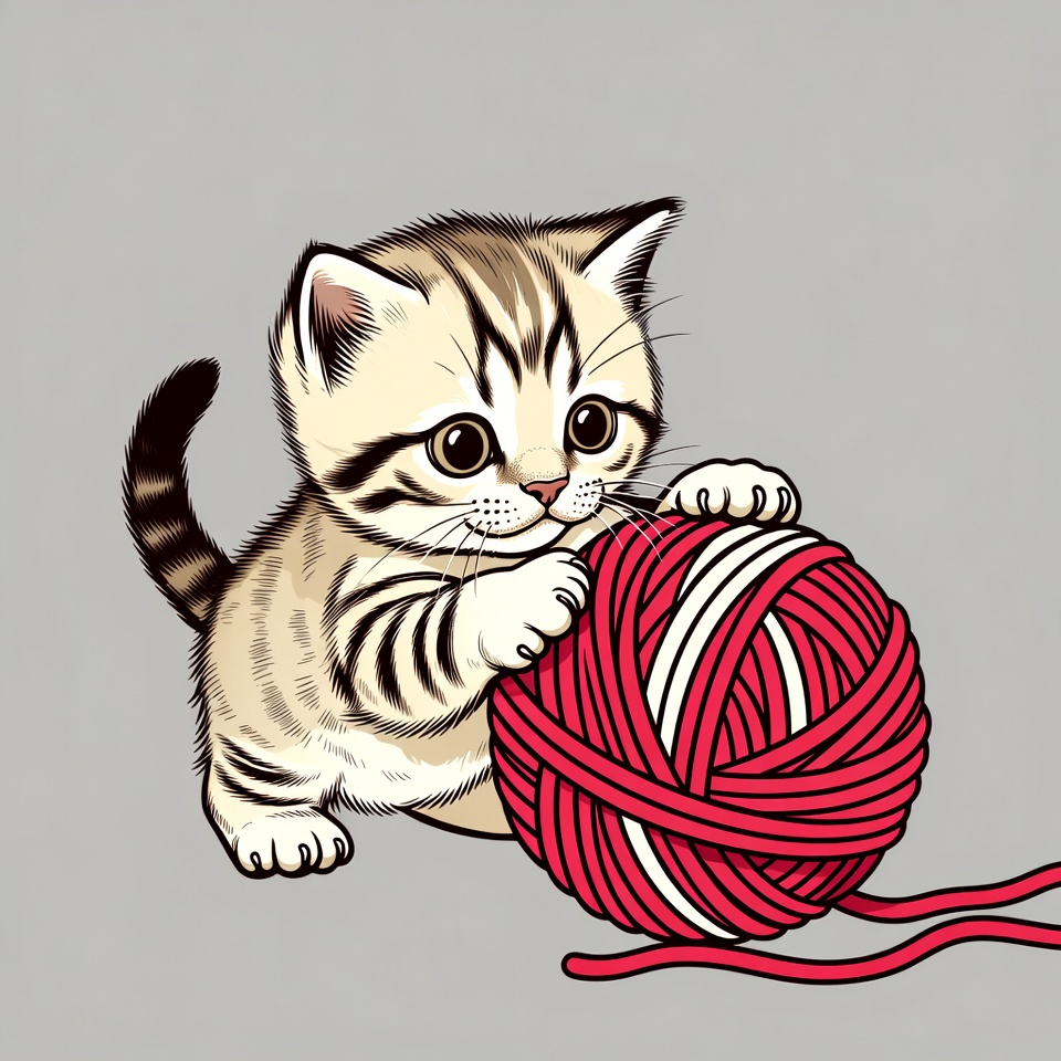 A cute tabby kitten with brown and white stripes plays with a large red and white yarn ball. The kitten grips the yarn with its paws and has wide, expressive eyes. The illustration is set against a plain gray background.