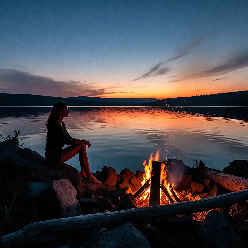A woman with long hair sits on rocks by a calm lake at sunset, wearing shorts and a sweater with bare feet. A bright campfire burns nearby with flames and sparks rising. The sky glows in orange and blue hues reflecting on the water.