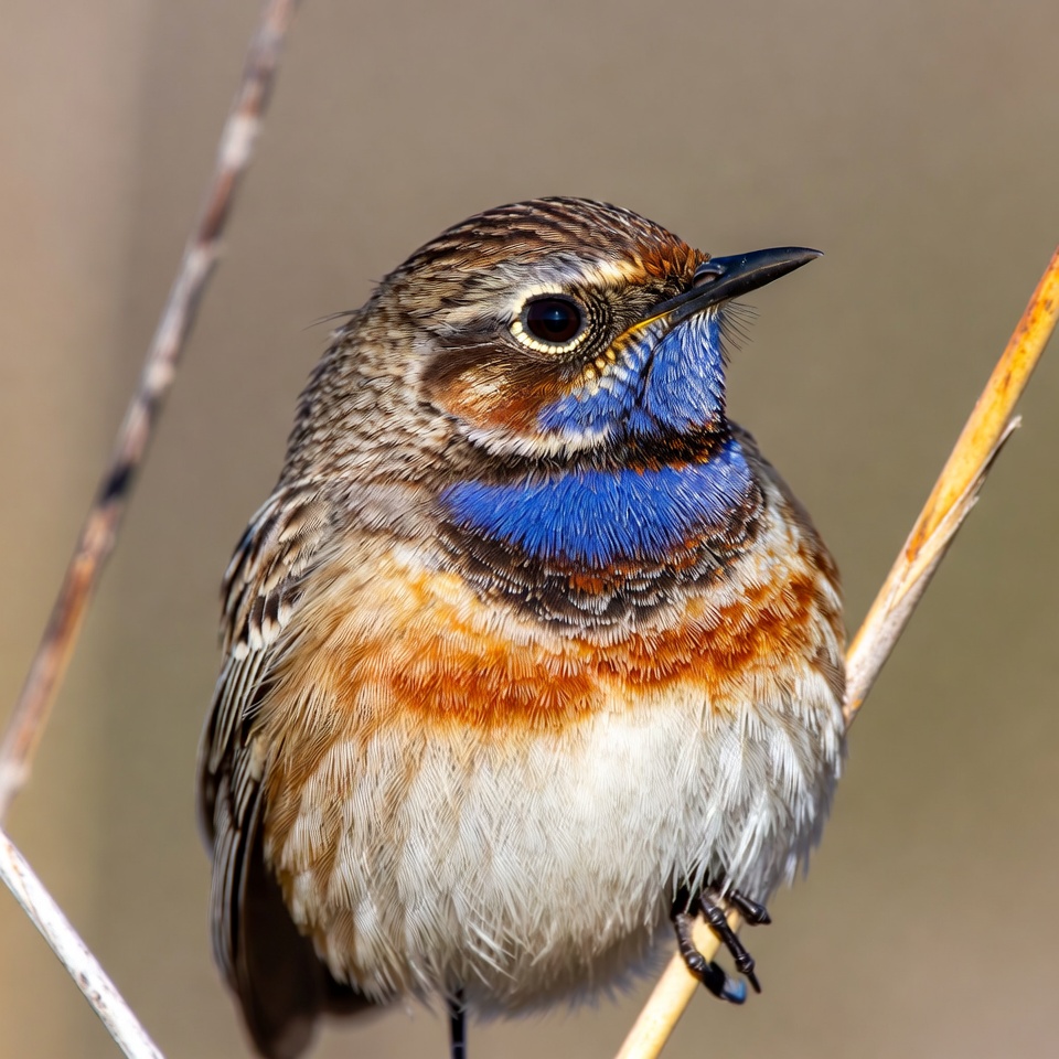 avian, bird, black beak, blue throat, brown streaks, eye ring, feathers, grass, isolated background, nature, orange breast, perched, reed stem, songbird, white belly, wild bird, wildlife, Lazuli Bunting
