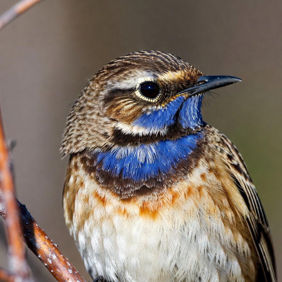 A male Splendid Fairy-wren with striking blue facial mask and throat feathers perches on a thin branch. Its brown and orange body features white underparts and striped patterns. The bird faces slightly to the side against a blurred natural background.