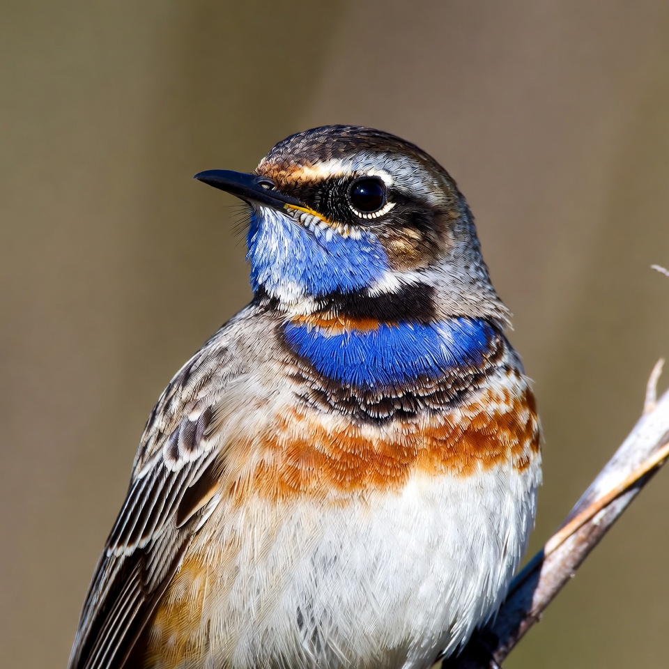 A small bird with a striking blue throat and orange-brown plumage perches on a thin branch. Its head features white and black markings above the bright blue bib, with a sharp black bill and dark eyes. The background is softly blurred with natural tones.