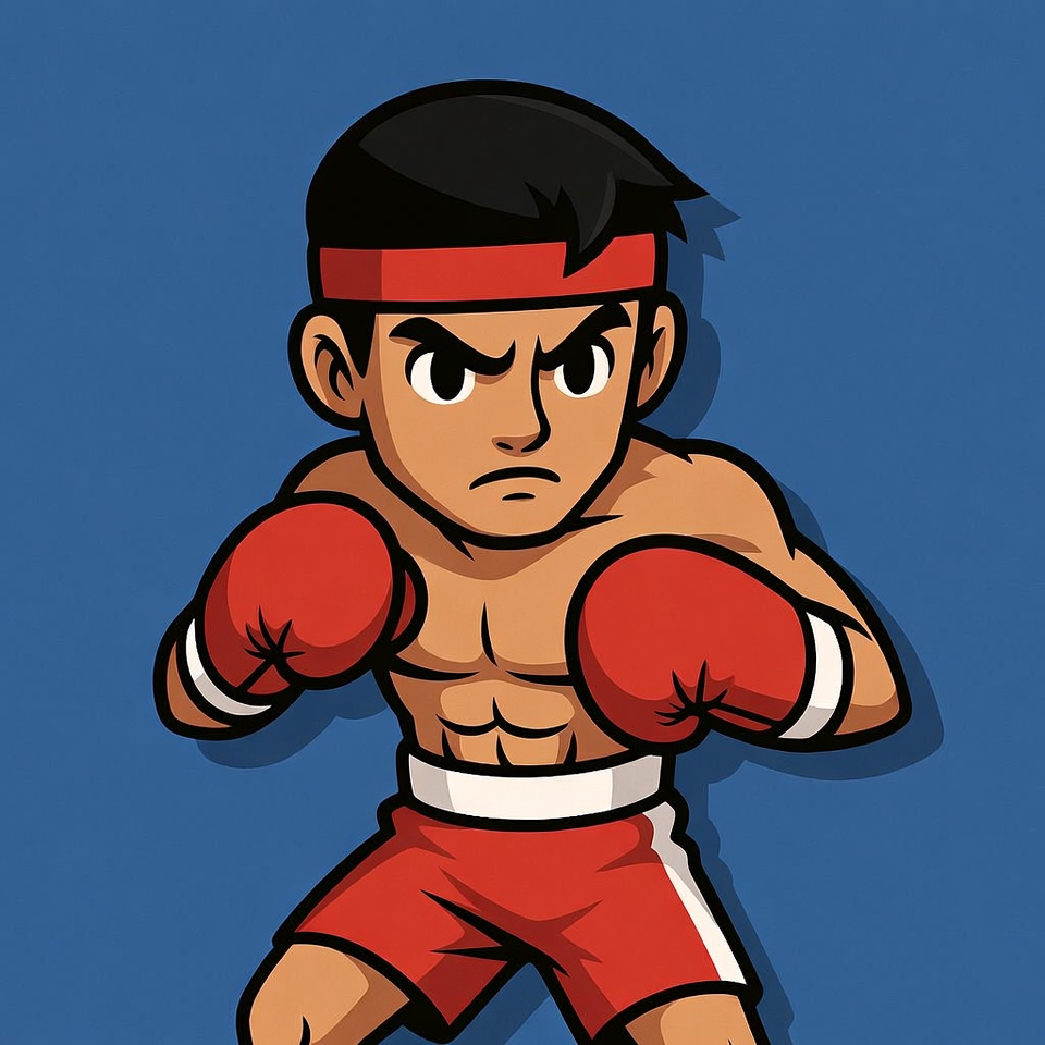 A cartoon illustration of a muscular Asian man in a boxing stance on a blue background. He wears red boxing gloves, a red headband, and red boxing shorts with white trim. His expression is intense with narrowed eyes and a serious face.
