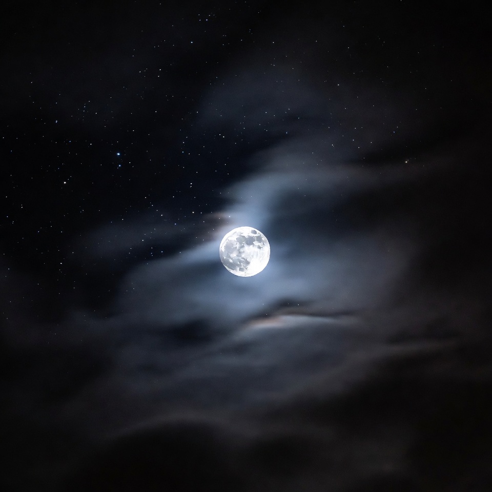 astronomy, celestial, clouds, cloudy sky, dark sky, glowing moon, lunar, moon, moonlight, night, night sky, sky, starry night, stars, full moon