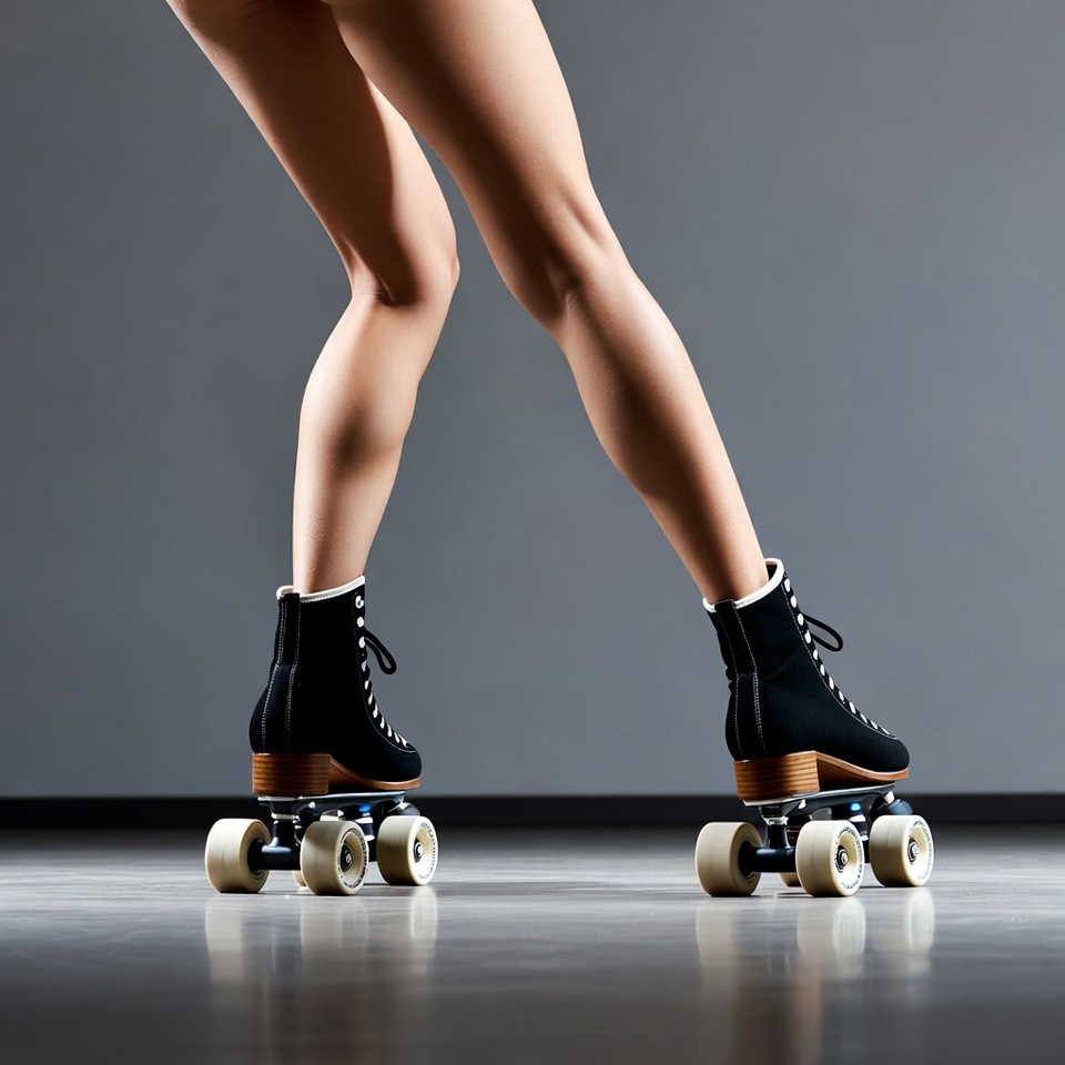 A nude woman with toned legs roller skates backward on a smooth gray floor. She wears black laced roller skates with white wheels. The image focuses on her rear view against a plain studio background.