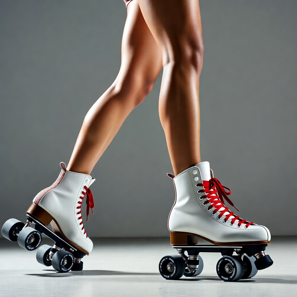 White, athletic, dynamic pose, exercise, female, fitness, gray background, isolated background, legs, low angle, quad skates, red laces, roller skates, rollerblading, short shorts, skating, sporty, toned legs, white skates, woman