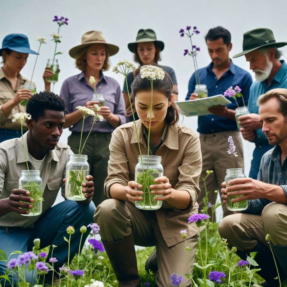 A diverse group of men and women in khaki field attire kneels and stands in a grassy field surrounded by purple wildflowers. They hold glass jars filled with fresh wildflowers and stems like Queen Anne's lace. Some examine a map while others smile and inspect the plants closely.
