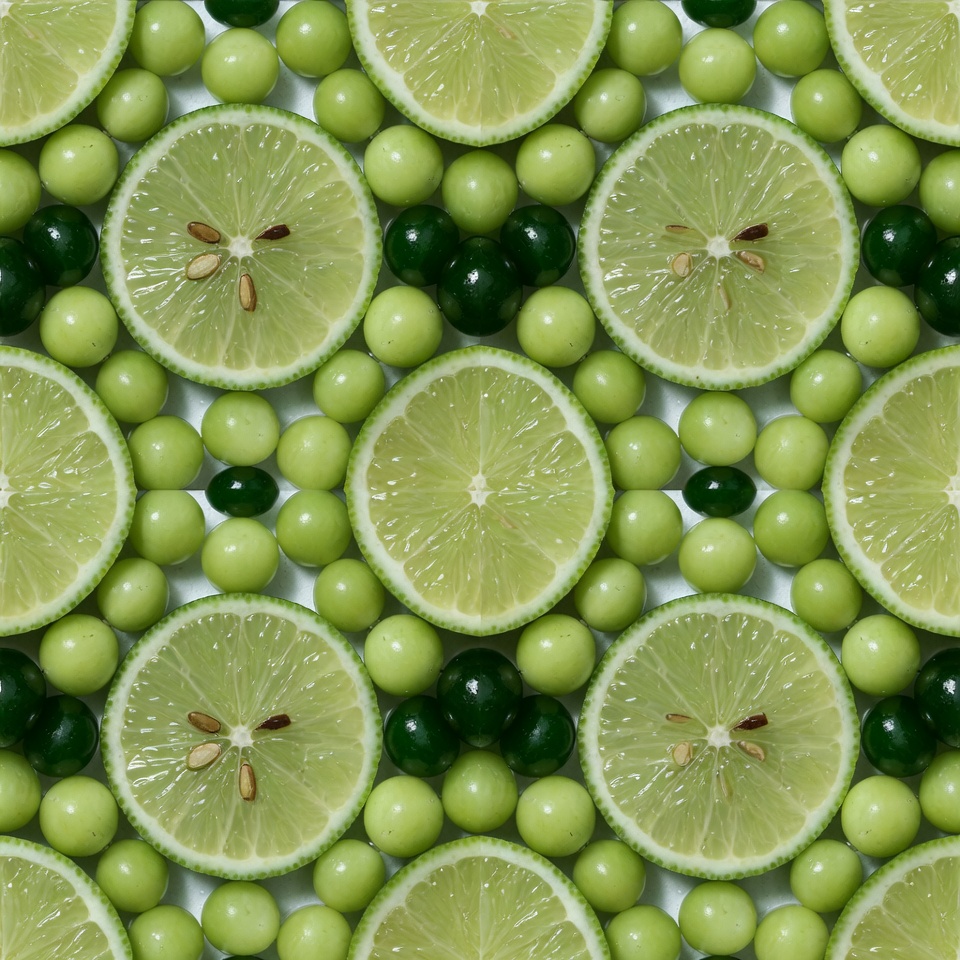 candy beads, candy pattern, citrus fruit, citrus pattern, food pattern, food texture, fresh fruit, fresh limes, fruit candy, fruit pattern, green background, green candies, green fruit, green mosaic, green pearls, halved limes, lime arrangement, lime design, lime halves, lime seeds, lime texture, pattern design, round candies, seamless texture, white background, lime slices