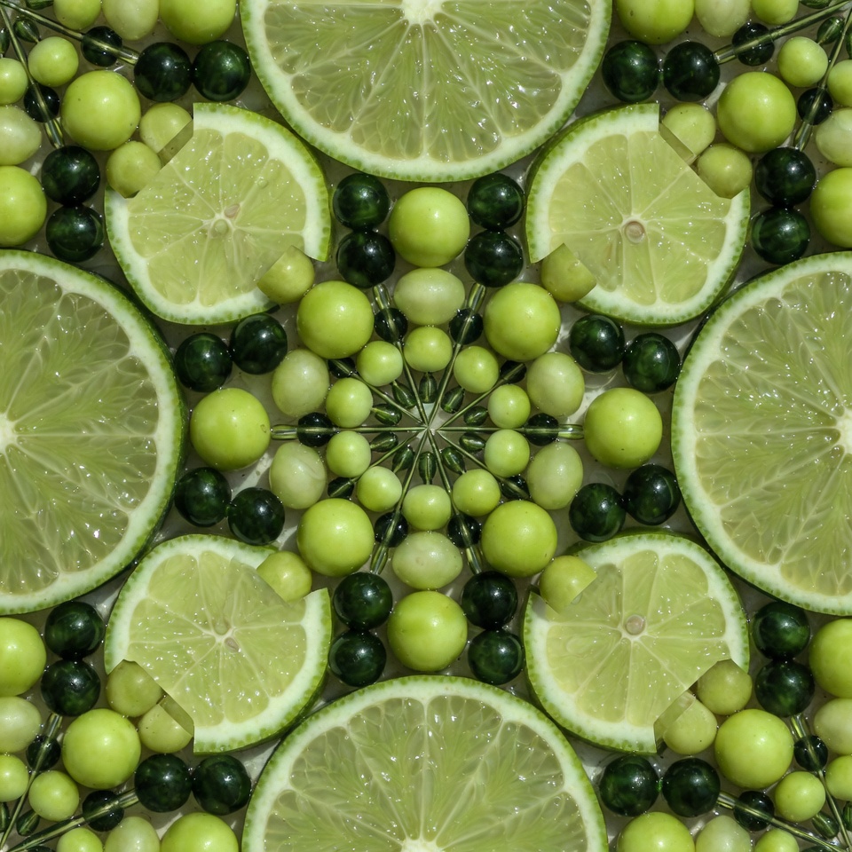 bead art, beads pattern, circular pattern, citrus fruit, food art, fresh limes, fruit pattern, green background, green beads, green limes, green pattern, isolated background, lime art, lime pattern, lime wedges, radial design, shiny beads, starburst design, symmetrical pattern, lime slices