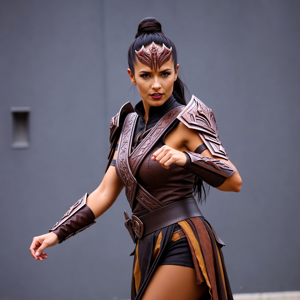 A woman with dark hair in a high bun and a horned headpiece stands in a dynamic fighting pose. She wears intricate brown leather armor with shoulder guards, arm bracers, and a short skirt over black shorts. The gray wall background highlights her detailed costume.