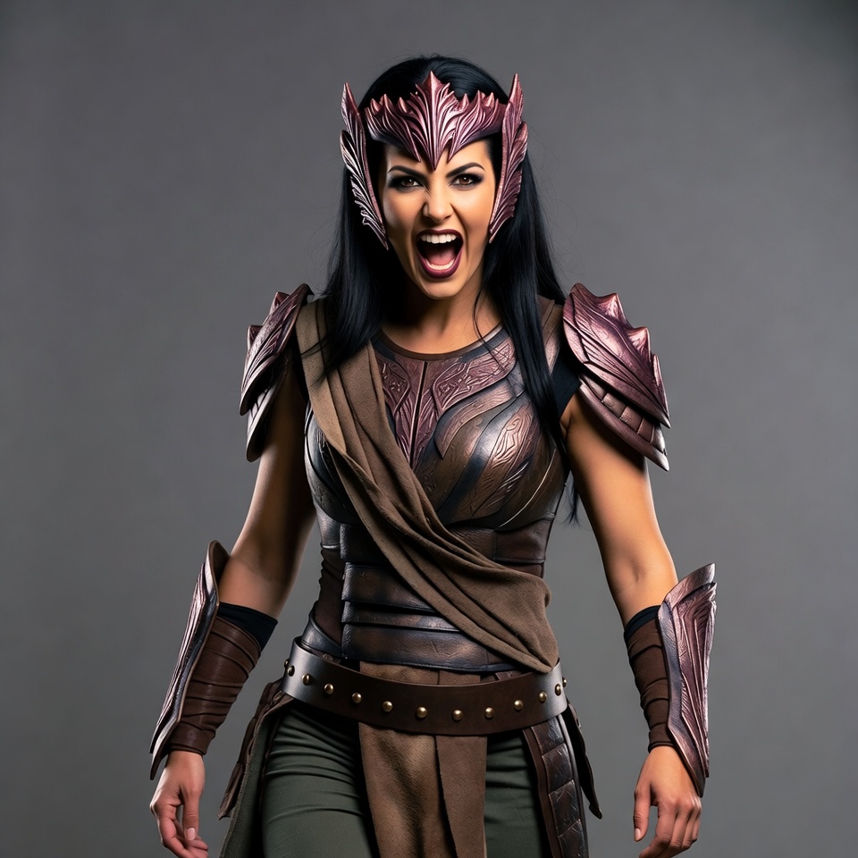 A woman with long black hair wears an elaborate maroon feathered headdress and matching metallic armor with shoulder guards and arm bracers. She stands aggressively with her mouth open in a fierce yell against a plain gray background. Her outfit includes a brown draped top, green pants, and leather belts.