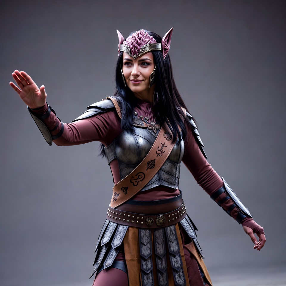 White, black hair, brown leather, chest plate, cosplay, costume, crown, dark elf, dynamic pose, elf ears, fantasy armor, female, gray background, helmet, long hair, medieval, purple helmet, raised hand, roleplay, shoulder guards, silver armor, skirt, warrior pose, woman, elf warrior