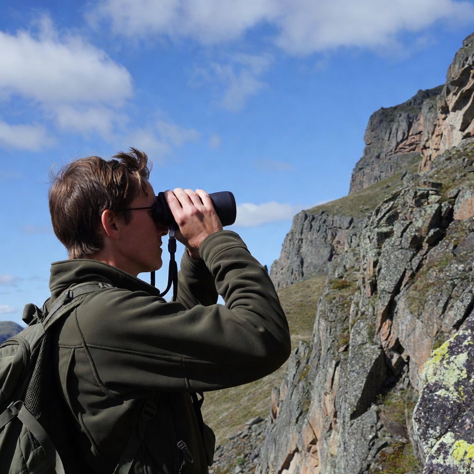 A young man with short brown hair and glasses uses black binoculars to look at rugged mountains. He wears a green jacket and backpack while standing on rocky terrain under a partly cloudy blue sky. The steep cliffs and green patches rise dramatically behind him.