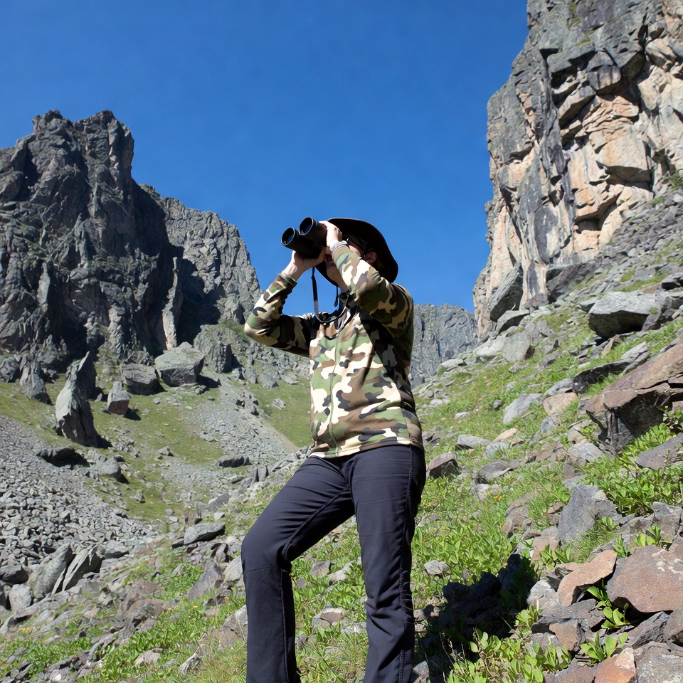 A woman wearing camouflage jacket and pants stands on a rocky mountain slope using binoculars to look ahead. Towering rugged cliffs and green grass surround her under a clear blue sky. She has her hat on and is positioned with one leg slightly forward.