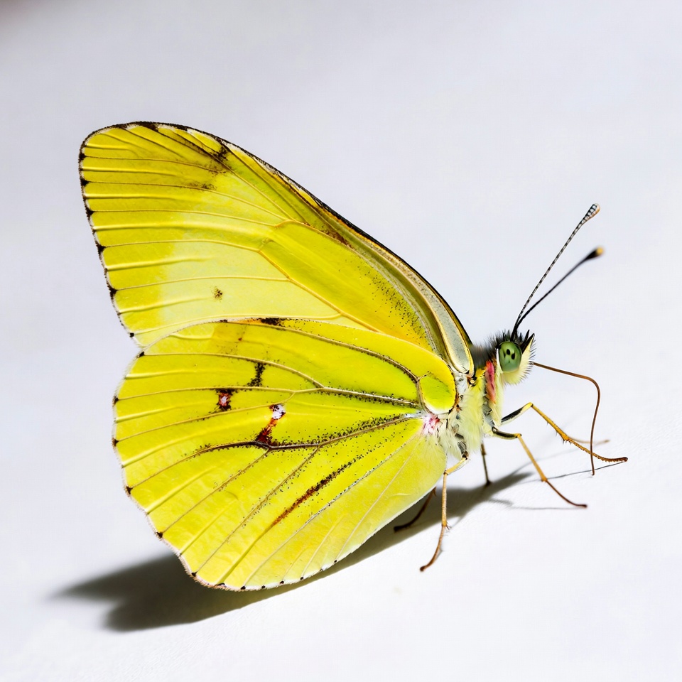 A vibrant yellow butterfly with spread wings rests on a plain white surface. Its wings feature subtle black spots and markings, with green edges near the head. Long antennae extend from its body, casting a small shadow beneath.