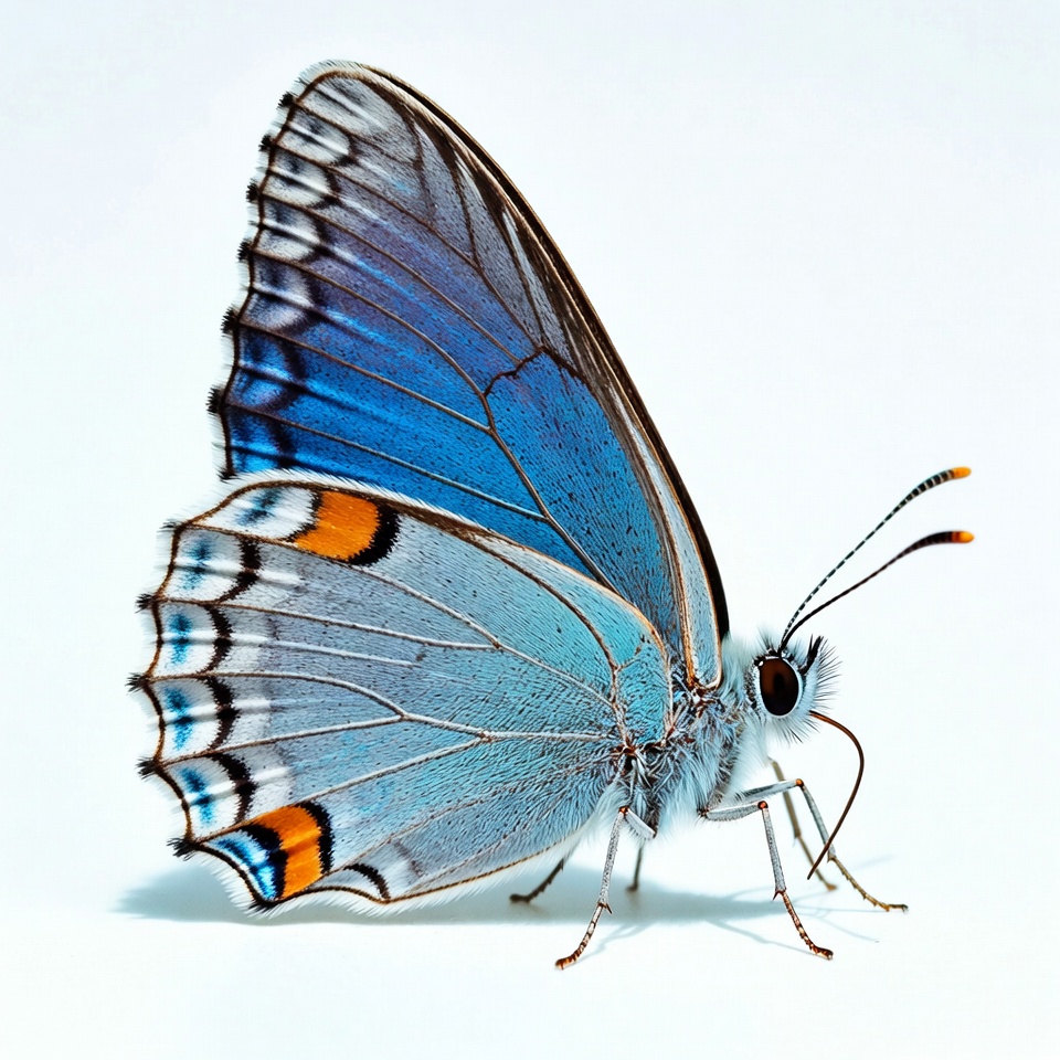 antennae, blue butterfly, detailed wings, eyes, gray patterns, insect, isolated background, macro, nature, orange spots, white background, white edges, wildlife, wings, butterfly