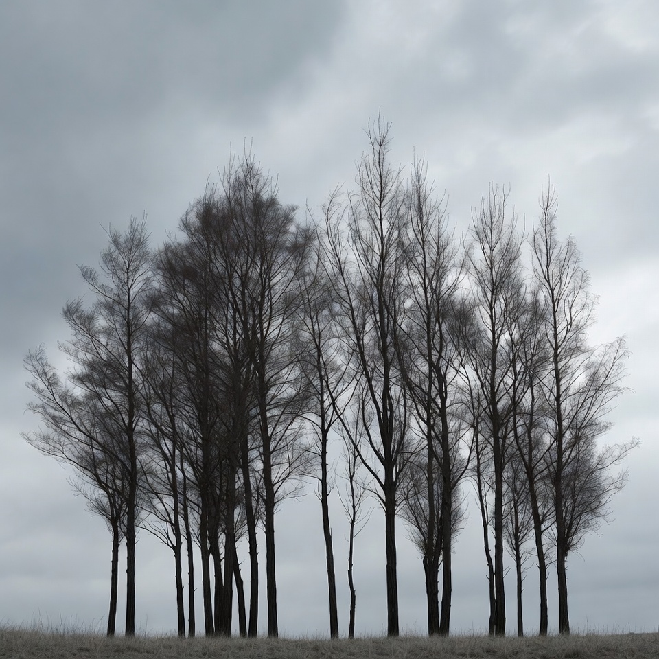 A cluster of tall, leafless trees stands in dark silhouettes against a vast gray cloudy sky. The trees feature thin, branching trunks and sparse twigs with no leaves. They are positioned on a flat grassy field at the horizon.