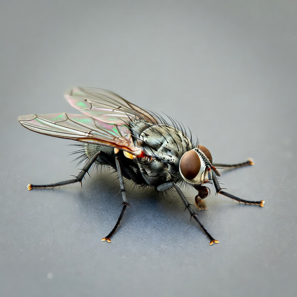 arthropod, black legs, compound eyes, diptera, fly, fuzzy body, gray background, insect, iridescent wings, isolated background, macro photography, house fly
