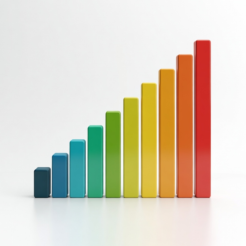 A 3D rendered bar chart features bars in rainbow colors rising from left to right on a white background. The bars progress from dark blue at the lowest to red at the highest. Each bar has a distinct vibrant color including cyan, green, yellow, and orange.