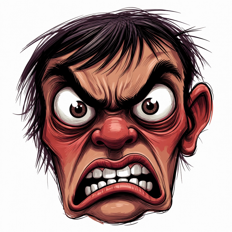 angry expression, bulging eyes, cartoon, clipart, comic style, dark hair, enraged, exaggerated features, flushed cheeks, furious, gritted teeth, illustration, isolated background, male, man, red nose, snarling mouth, vector art, wild hair, angry face