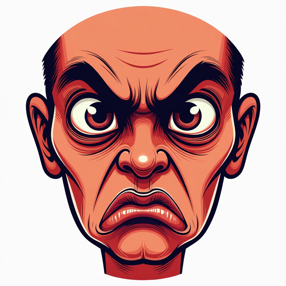 Asian, aggressive face, angry man, bald man, bold lines, cartoon face, clipart, enraged expression, frowning mouth, furious look, glaring eyes, illustration, isolated background, male, red face, vector art, angry face