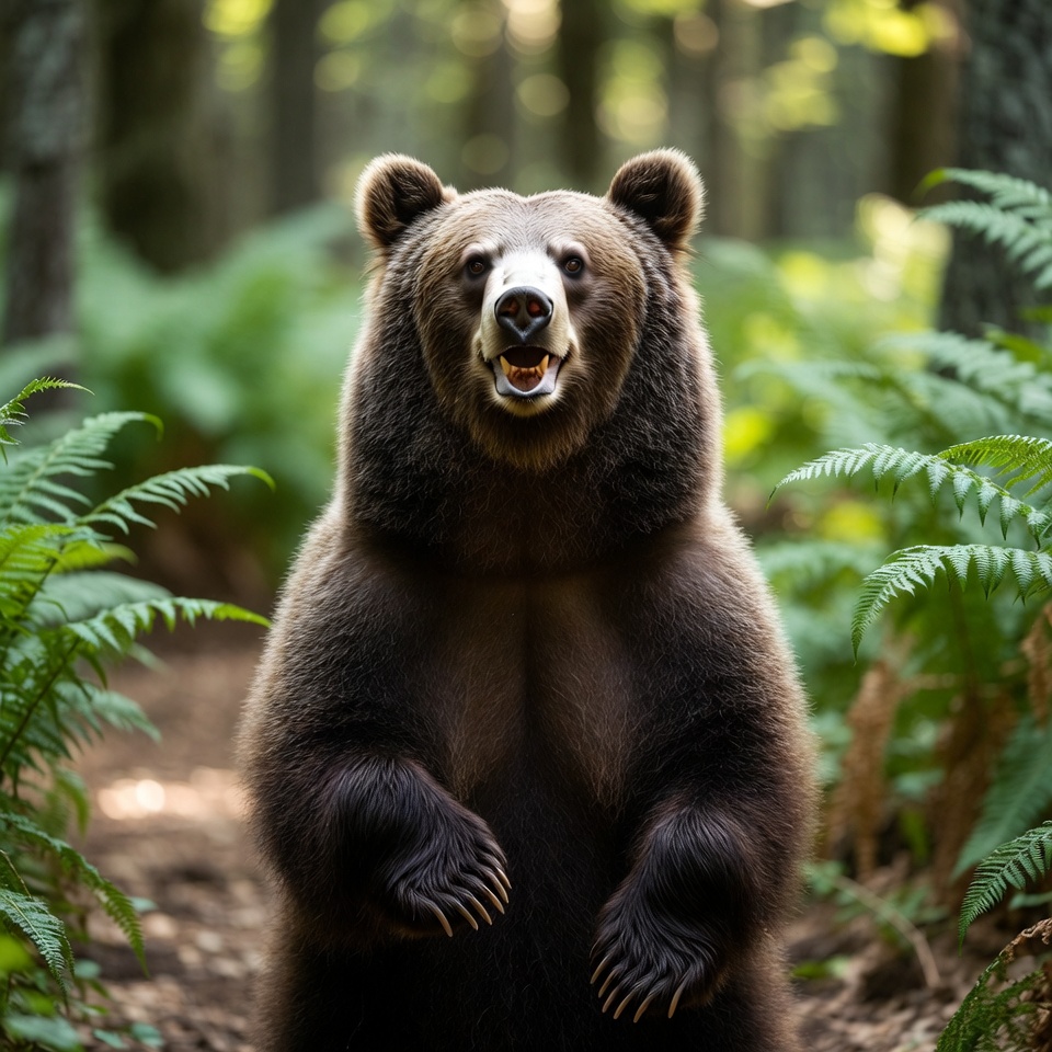 animal, bear, dense forest, ferns, forest, fur, green ferns, grizzly bear, mammal, nature, paws, roaring bear, standing bear, sunlight, teeth, trees, wild animal, wildlife, woods, brown bear