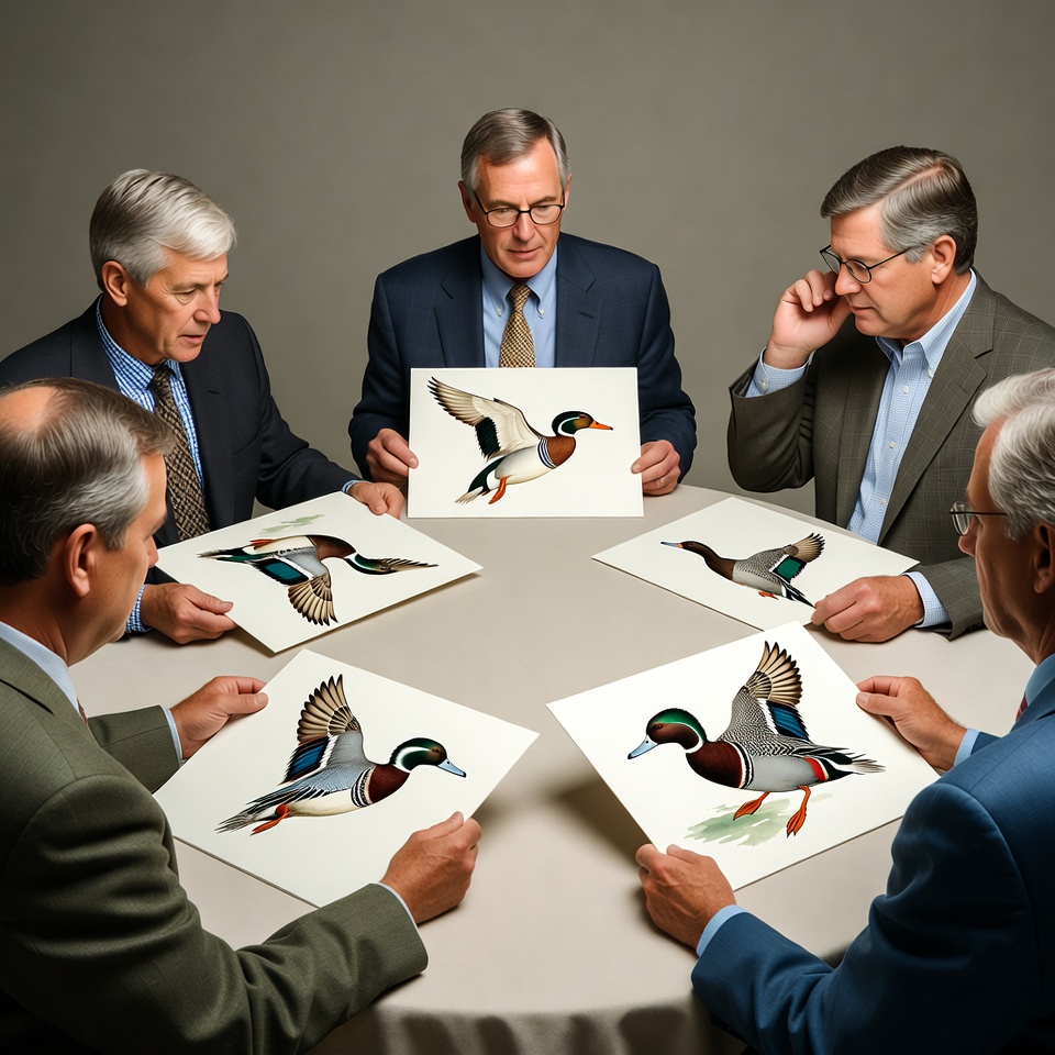 Six elderly White men in suits sit around a round table, each holding a white card with a colorful illustration of a mallard duck in flight. They appear to be in a meeting, attentively viewing the detailed duck artwork featuring green heads, white neck bands, and wings spread. The background is plain gray, emphasizing the group and the duck images.