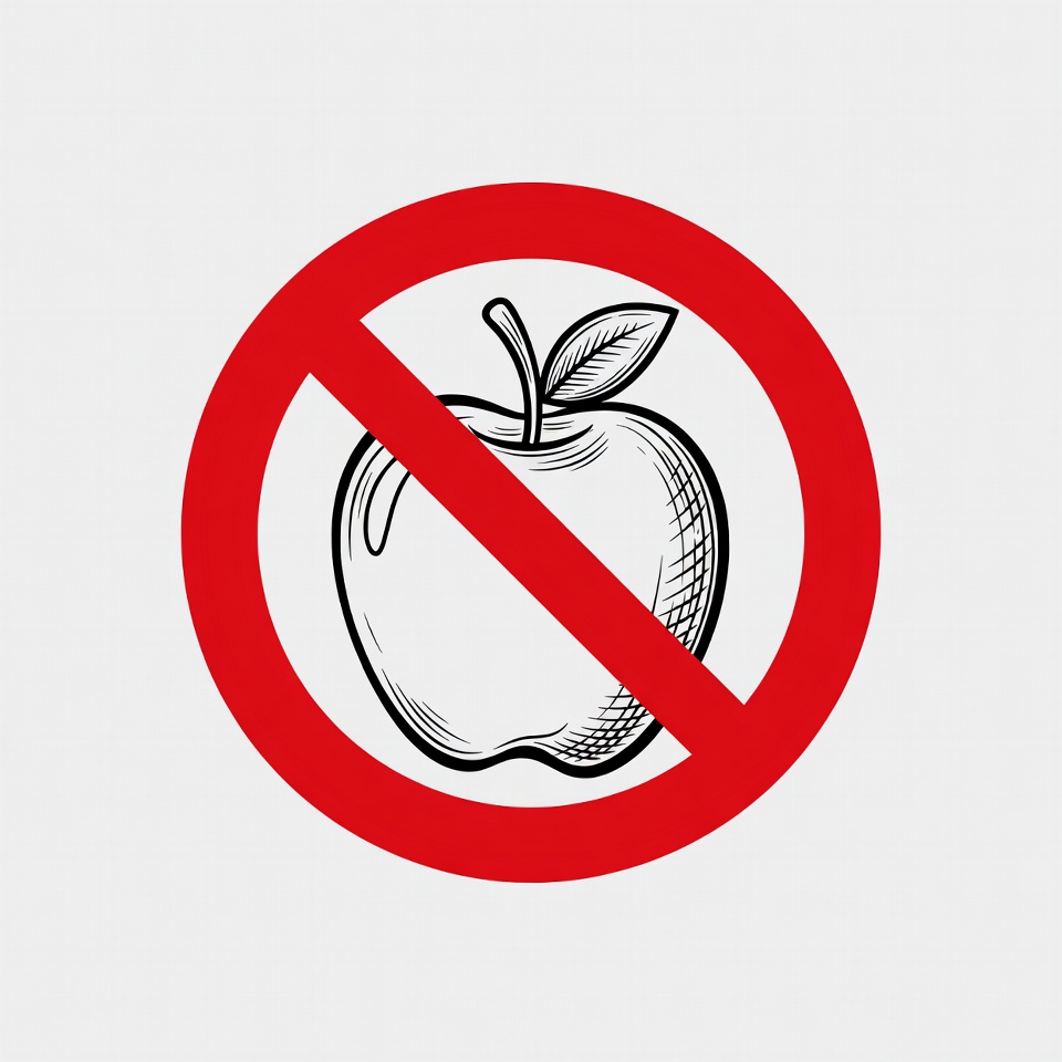 A black line drawing of a shiny apple with a green leaf is centered within a bold red prohibition circle and diagonal slash. The apple features detailed shading and stem. The image is set against a plain white background.