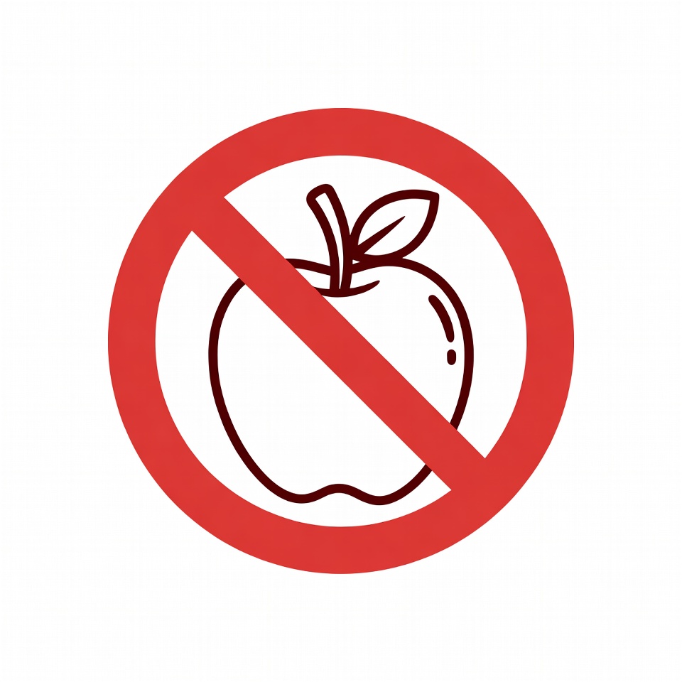 A red prohibition sign features a black outline of a shiny apple with a green leaf. The diagonal red slash crosses through the apple, indicating it is forbidden. The icon is simple and isolated on a white background.