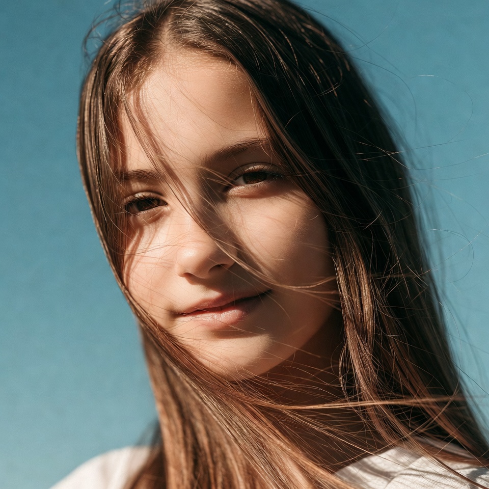 A young teen girl with long brown hair smiles softly at the camera against a bright blue sky. Sunlight highlights her face and hair, creating a gentle glow. She wears a white top and looks directly forward.