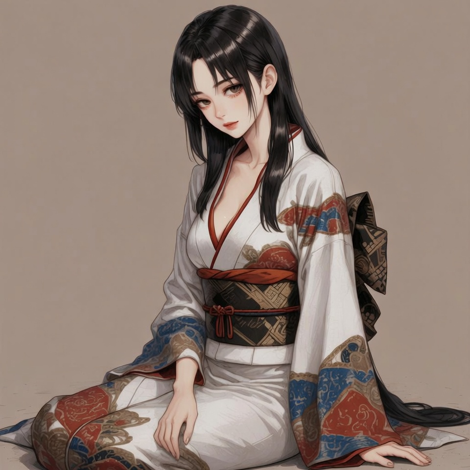 Asian, Japanese clothing, anime style, beautiful woman, blue accents, digital art, female, floral design, illustration, isolated background, kimono, long black hair, long hair, obi sash, red patterns, serene expression, sitting, traditional attire, white kimono, woman