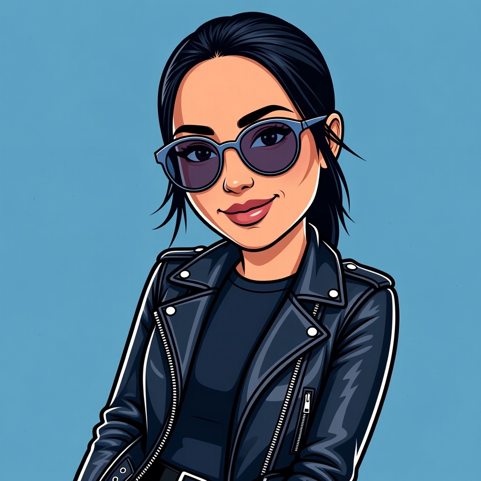 anime style, black jacket, blue sunglasses, cartoon, clipart, confident smile, cool woman, dark hair, edgy style, female, graphic design, illustration, isolated background, leather jacket, modern fashion, portrait, smiling, sunglasses, vector art, woman, Asian woman