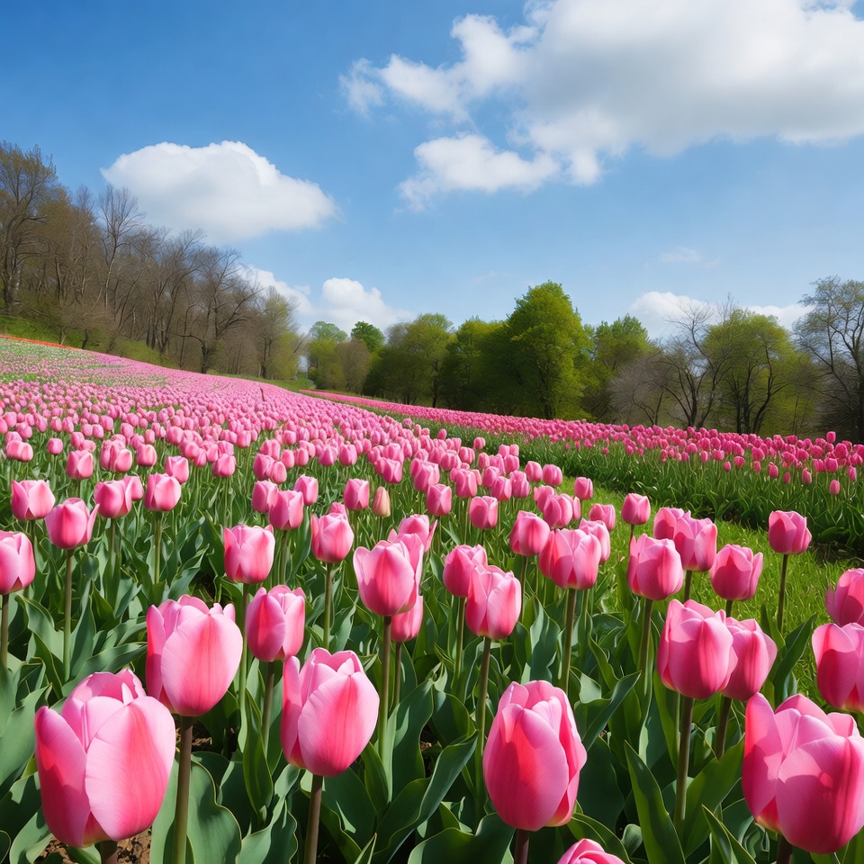 Pink Tulip Field Under Blue Sky