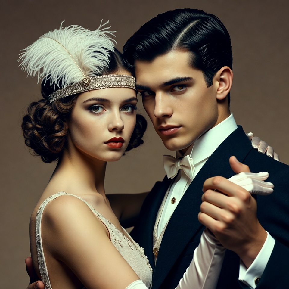 1920s style, Gatsby style, White, art deco, ballroom dance, beaded dress, black tuxedo, bow tie, close embrace, dancing pose, elegant couple, feathered headband, flapper dress, flapper girl, formal attire, intimate dance, man, neutral background, retro clothing, slicked hair, tuxedo man, vintage fashion, wavy bob, white gloves, woman, 1920s couple