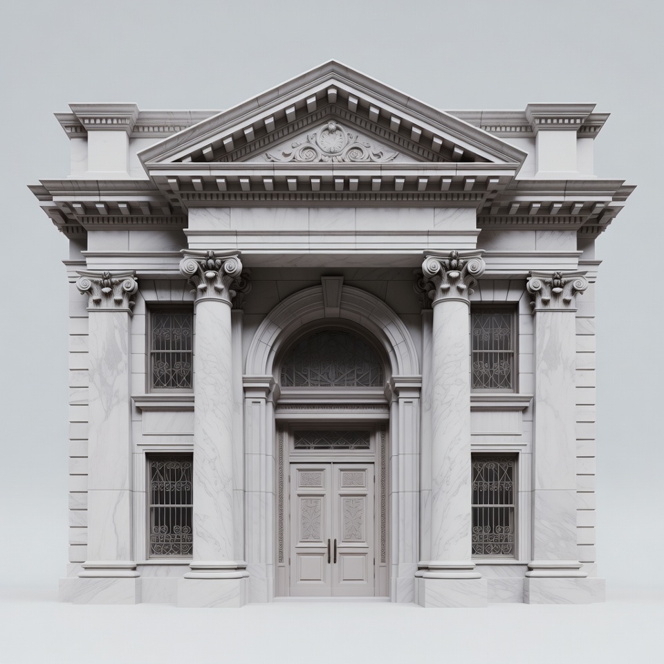 3D render, Corinthian columns, arched windows, architectural details, architecture, classical architecture, columns, double doors, facade, grand entrance, greek architecture, historic building, isolated background, ornate carvings, pediment, roman architecture, stone building, symmetrical design, temple facade, neoclassical building