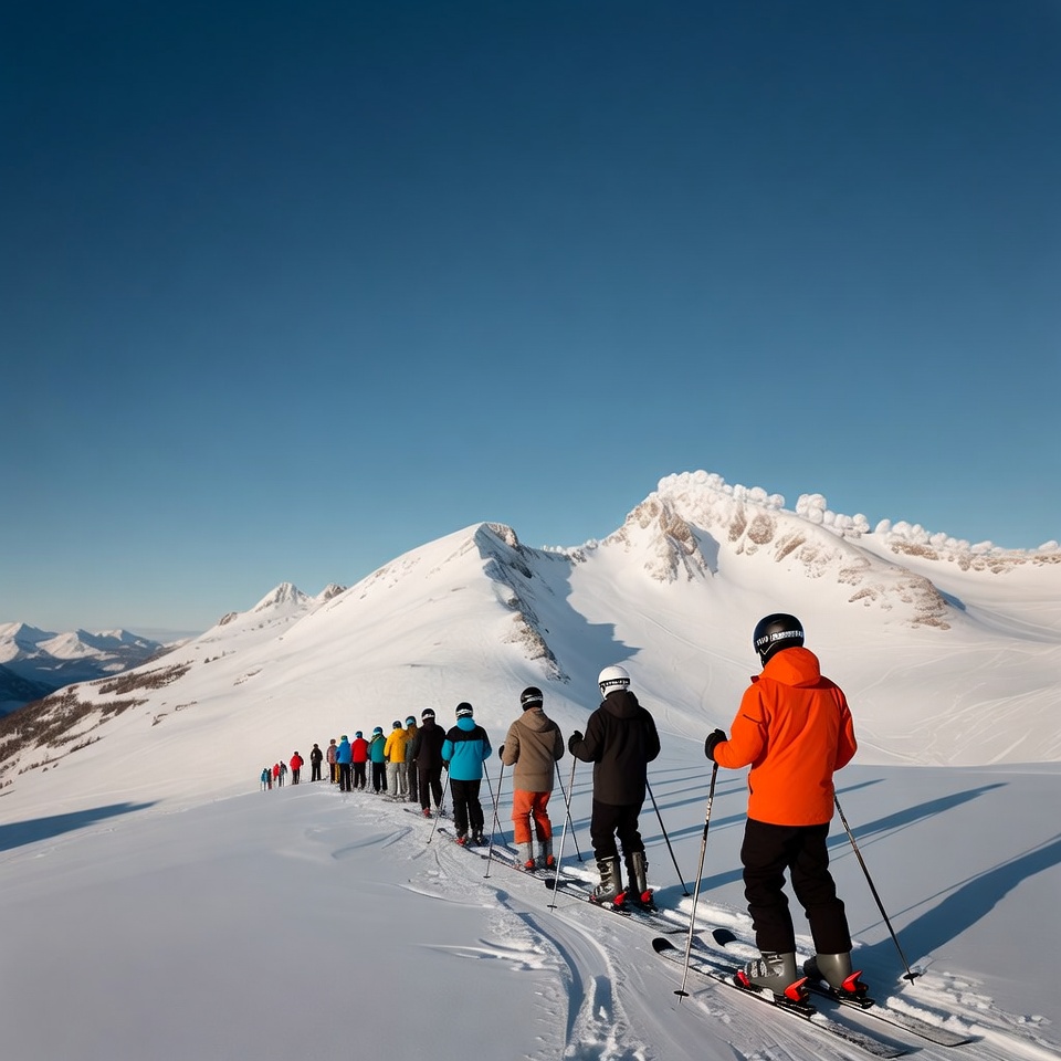A long line of skiers in colorful jackets and helmets skis single file up a steep snowy slope toward snow-capped mountain peaks. They carry ski poles and wear ski boots and goggles under a clear blue sky. The group follows a groomed track on the bright white glacier.