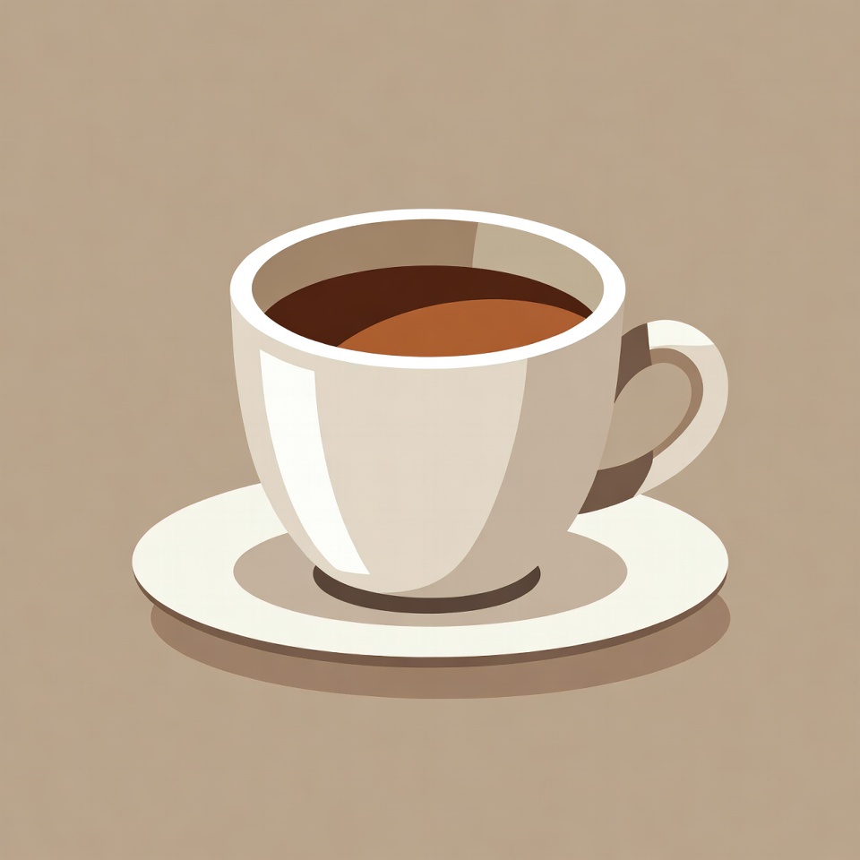 A white ceramic coffee cup filled with dark brown coffee sits on a matching white saucer. The cup features a curved handle and subtle shading for depth. The illustration is set against a solid beige background.