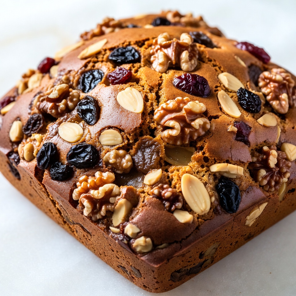 A square fruitcake topped with walnuts, almonds, dried cherries, and raisins sits on a white surface. The cake has a golden-brown crust with visible cracks and embedded fruits and nuts. Glaze glistens on the surface, highlighting the assortment of toppings.