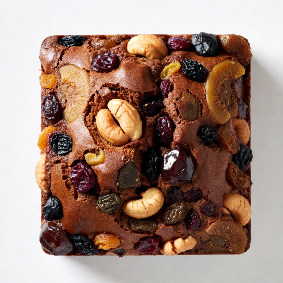 baked goods, cake, candied fruit, cashews, cherries, citrus peels, dessert, dried fruits, food photography, holiday cake, kiwi fruit, nuts, prunes, raisins, rich batter, square cake, textured surface, top view, white background, fruitcake
