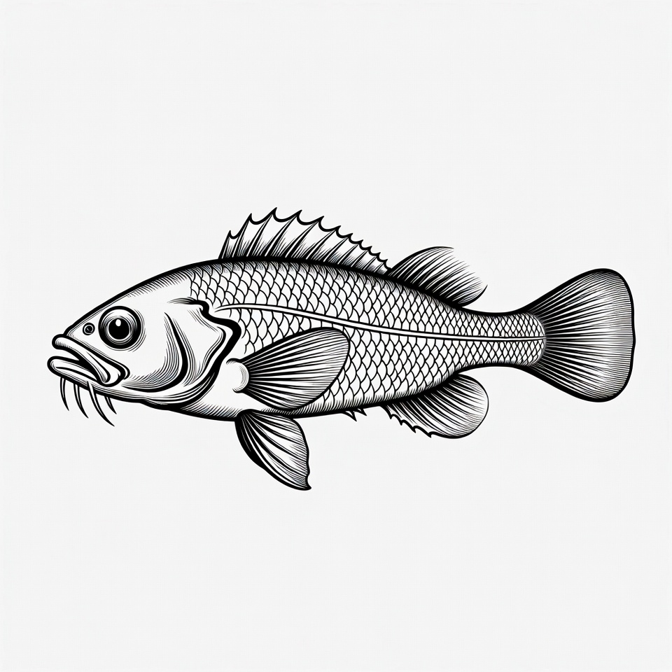 aquatic animal, barbels, black and white, clipart, detailed fish, fish, grayscale, illustration, ink drawing, isolated background, line art, marine life, ocean fish, perch fish, scales, side view, spiny fins, vector, sea bass