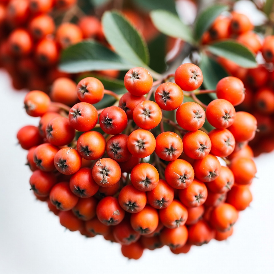 berries, botanical, bright red, bunch, cluster, foliage, fruit, green leaves, isolated background, mountain ash, nature, plant, ripe berries, rowan berries, white background, red berries