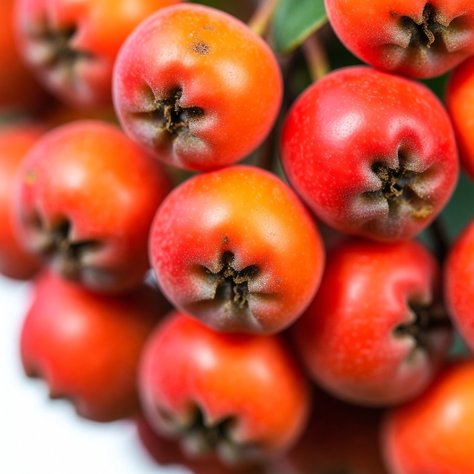 A close-up view shows a dense cluster of vibrant red mountain ash berries with small brown seeds at their tips. The berries are attached to green leaves and set against a white background. The image highlights the textured skins and rich orange-red hues of the ripe berries.