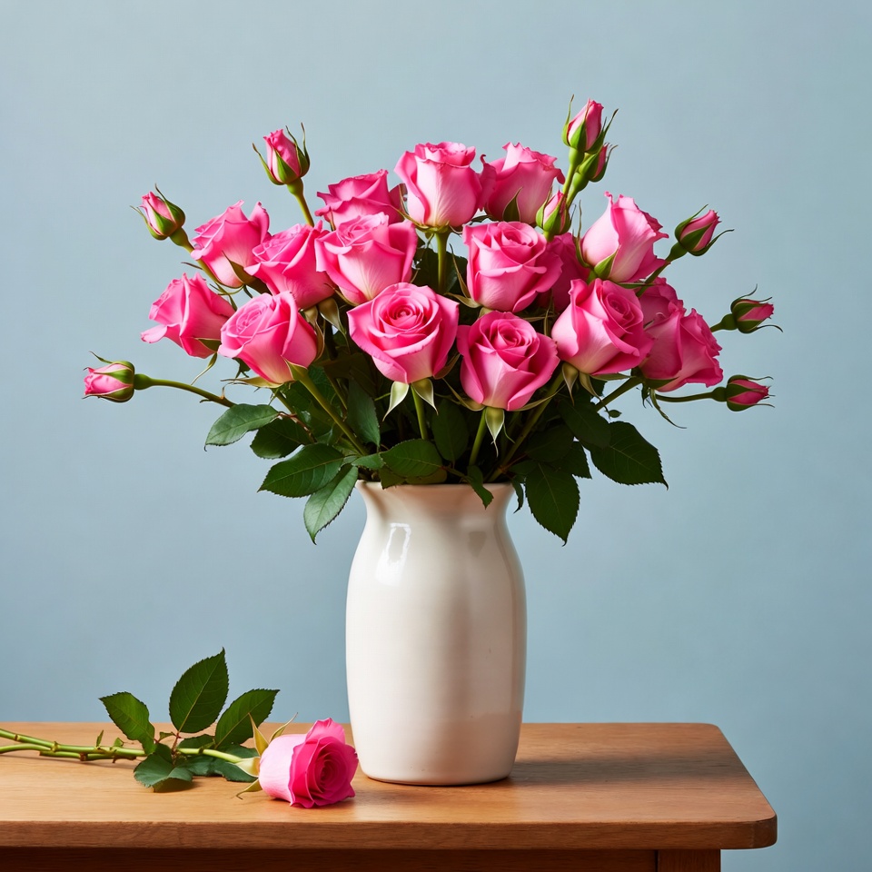 A bouquet of vibrant pink roses with green leaves is arranged in a white milk jug vase on a wooden table. A few scattered rose leaves and a single pink rose bud lie beside the vase. The background is a soft blue.